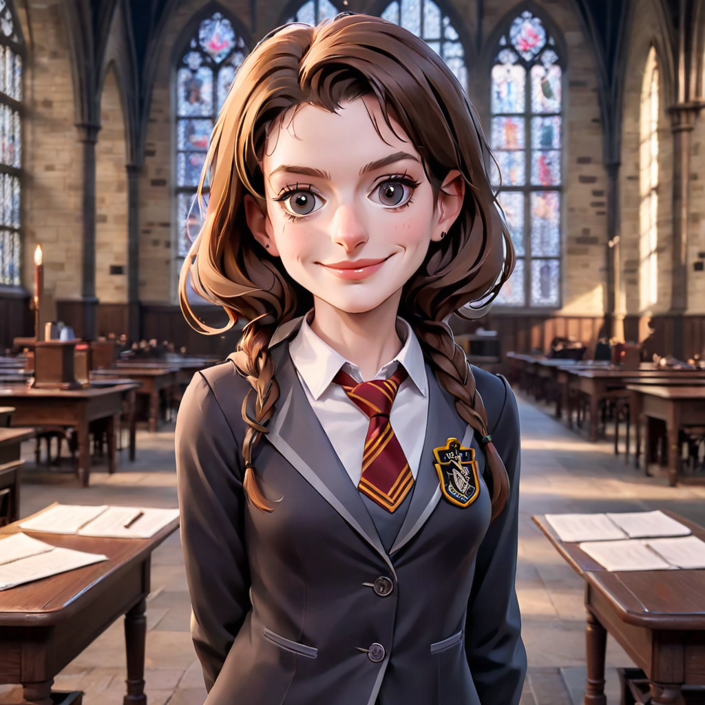 1 girl img, masterpiece,3D,best quality,8K,official art,ultra high res,hogwarts school uniform,solo,school uniform,smile,necktie,focus,freckles,brown hair,looking at viewer,