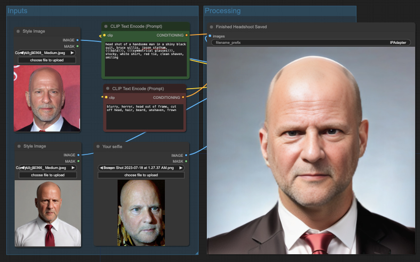 👉 It uses the two style images with ip adapter to manage the look and feel of the image. Use a good couple head shots of an actor that looks similar to you wearing a suit. The positive and negative prompt is used to generate the image along with those two style images. Try adjusting those prompts to finetune the results. The selfie image is used by Reactor Fast Face Swap with face fix to put the persons face on the resulting image and clean it all up.