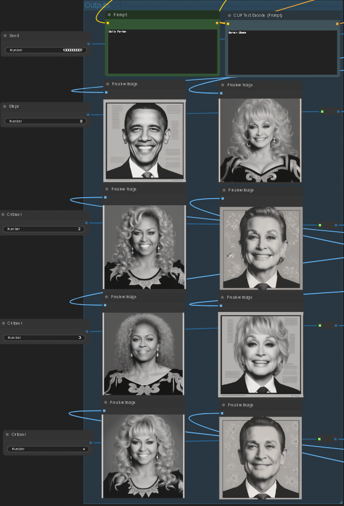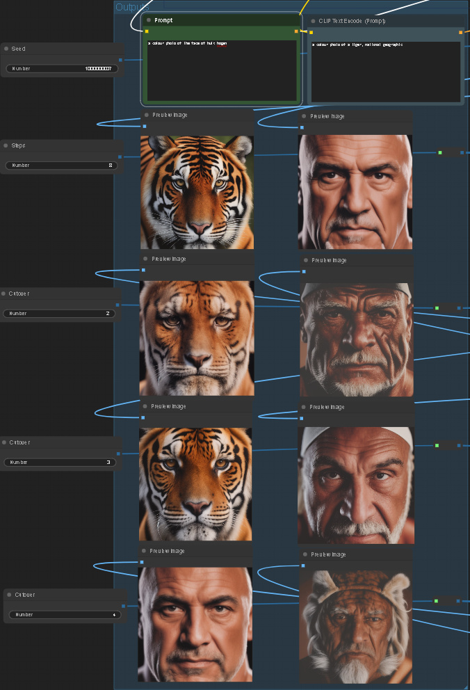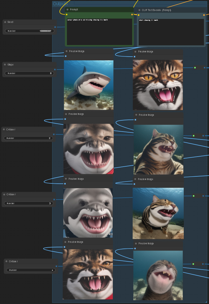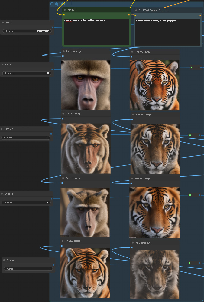 Set the two prompts and hit generate. Â If you alter the number of steps you will need to update the three cutovers.