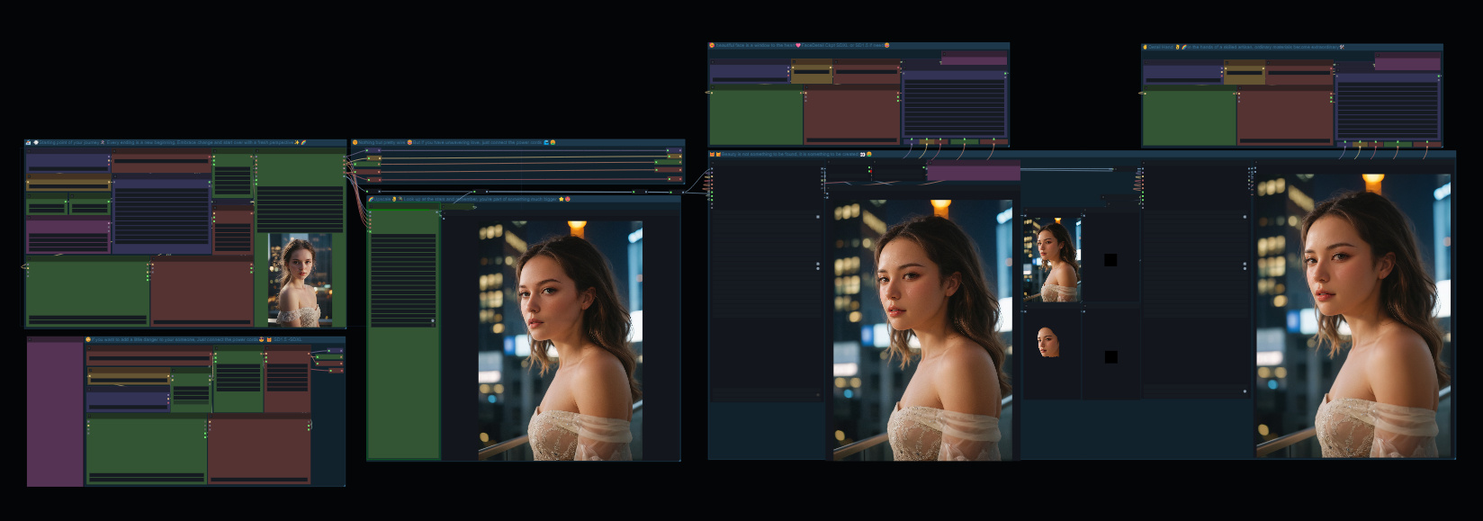 I just started using ComfyUI a week ago and I've been having a blast! One thing I noticed right away was how messy all the node connections could get. It was driving me crazy, haha. So I decided to reorganize everything and created this simple workflow where I tried to hide as many wires as possible. 🤩