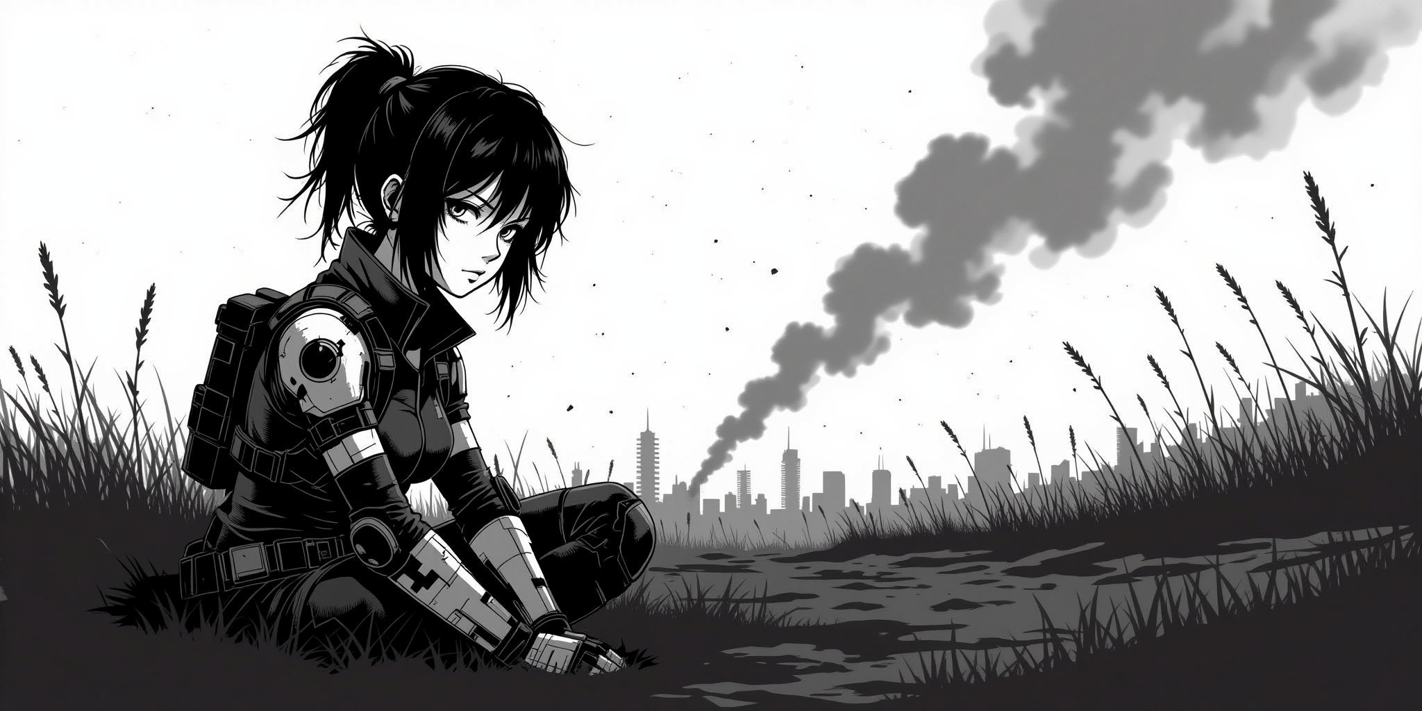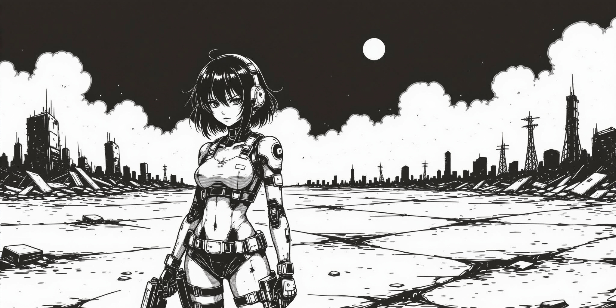 "android girl in post-apocalyptic wasteland, black and white ink, Floyd–Steinberg dithering, hard manga lines, Masamune Shirow energy"