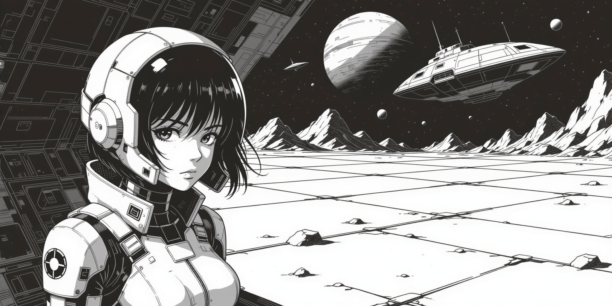 space explorer woman floating, manga black and white, Atkinson dithering, soft shadowed tone, inspired by Leiji Matsumoto