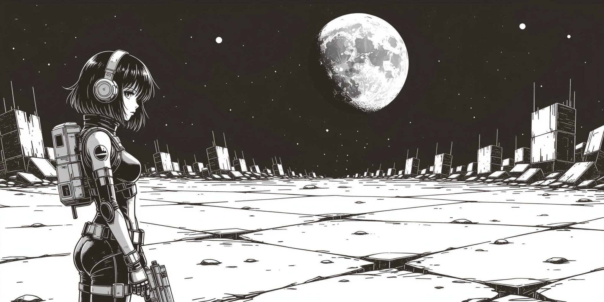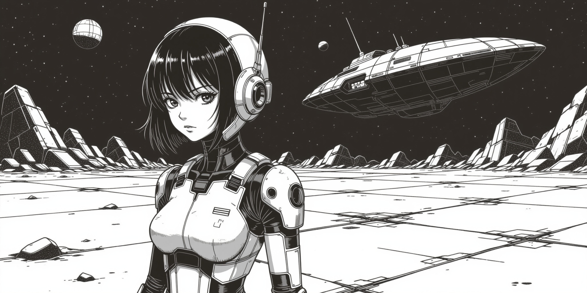 "ghostly cosmonaut girl, space suit tears, Jarvis dithering, floating pose, retro sci-fi manga tone, Taiyō Matsumoto energy"