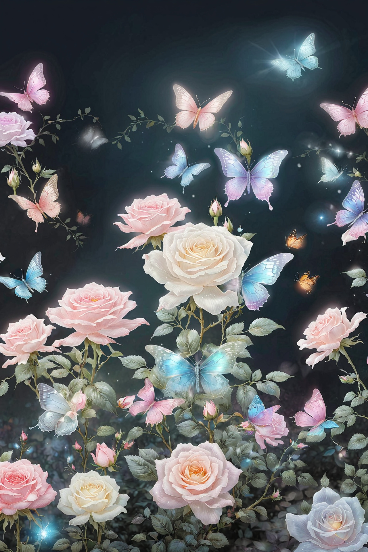a beautiful 3d spectral crystal flower, soft fairy mist rose, transparent petals, colorful butterflies flying around the rose, black background,Beautiful visual content structure