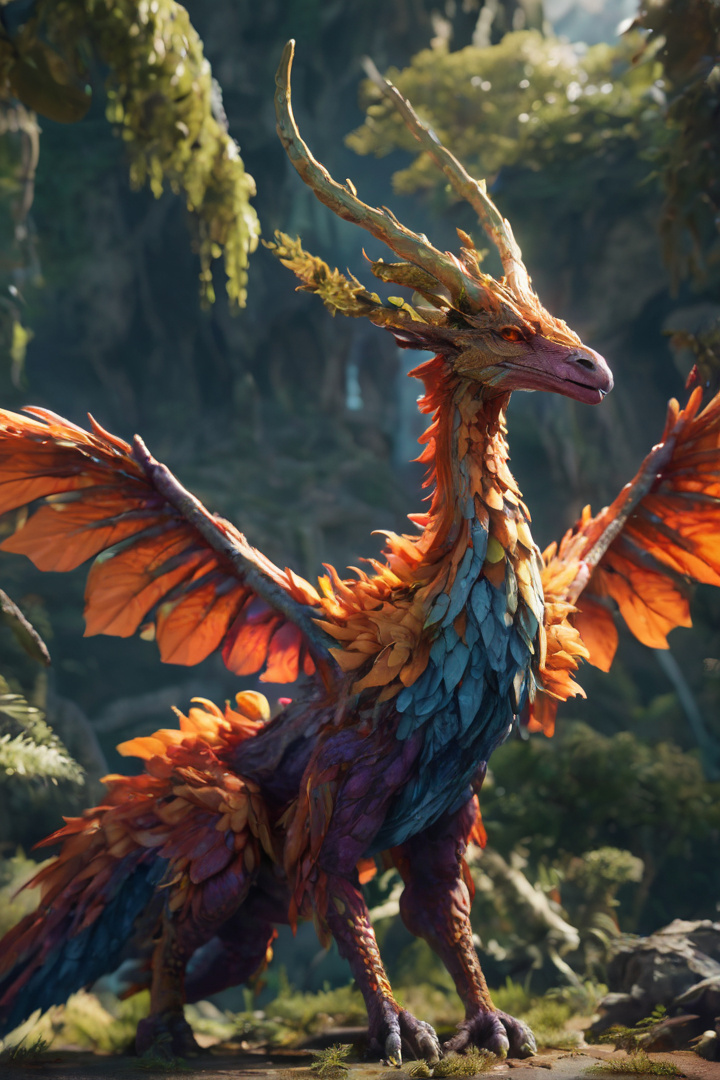 an otherworldly 8k landscape in Unreal Engine, featuring hyper-detailed elements and a vivid color palette. Envision a mythical creature with elegant wings and a majestic pose. The composition is cinematic, utilizing color grading, depth of field, and ultra-wide-angle cinematography. Lighting techniques include natural lighting, volumetric lighting, and contre-jour. The scene is beautifully color-coded, with global illumination enhancing the creature's presence. The resolution is 8k, and the aspect ratio is 16:9, delivering an enchanting and fantastical visual experience.